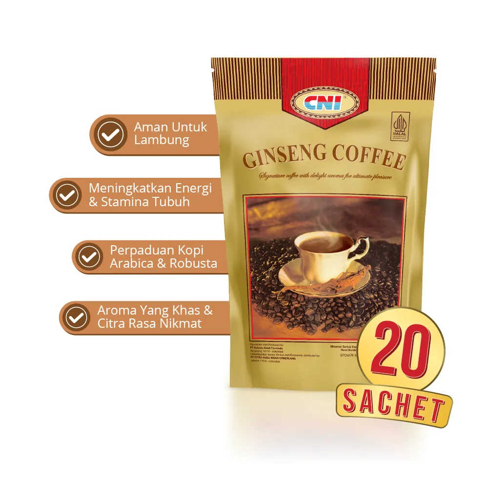 CNI Ginseng Coffee adalah pioneer kopi ginseng di Indonesia sekaligus produk unggulan CNI yang telah dipasarkan sejak tahun 1994. Memiliki aroma yang khas dan cita rasa nikmat yang tidak akan dilupakan para penikmat kopi. CNI Ginseng Coffee terbuat dari perpaduan kopi arabika, robusta dan ginseng yang terjamin kualitasnya. Proses pembuatan dilakukan dalam pengawasan ketat dengan standar mutu tinggi (GMP). Isi : 20 Sachet @20gr ​BPOM RI MD 667031013044