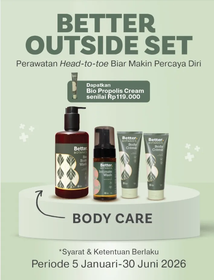BETTER OUTSIDE – BODY CARE SET Makin Percaya Diri dengan Perawatan Tubuh Alami Dapatkan Bio Propolis Cream senilai Rp119.000 Periode: 05 Januari – 30 Juni 2026 S&K: Tersedia di hdi.com dan Center HDI Promo berlaku kelipatan Berlaku untuk Bee maupun Enterpriser Pembelian tidak dapat menggunakan Nectar Tidak bisa mendapatkan poin Nectar (kecuali 5% Nect